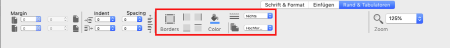 Über „Borders“ können Sie einen Rahmen erstellen. Entweder direkt um den ganzen markierten Text über die Box oder nur einzelne Teile des Rahmens. Die Farbe und die Art des Rahmens (Linie, gestrichelt, gepunktet, etc.) können ebenfalls eingestellt werden.