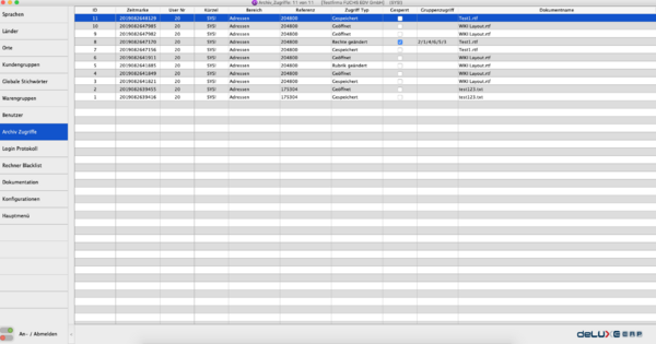 Im Administrator Bereich wird eine Liste mit allen Archiv Zugriffen eingeblendet. In dieser Liste stehen der Such- und Sortiereditor zur Verfügung.