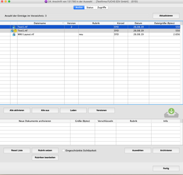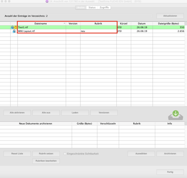 Hinweis: Die Rubrik kann auch nachträglich für bereits archivierte Dateien gesetzt werden. Hierfür klicken Sie in der oberen Liste in die Spalte Rubrik. Diese Option steht nur zur Verfügung, wenn die Datei mit dem Archiv Plus Modul auf den Server geladen wurde.