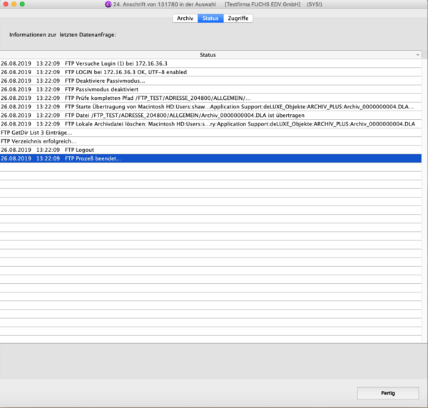 Unter dem Reiter "Status" wird die letzte Aktion angezeigt.