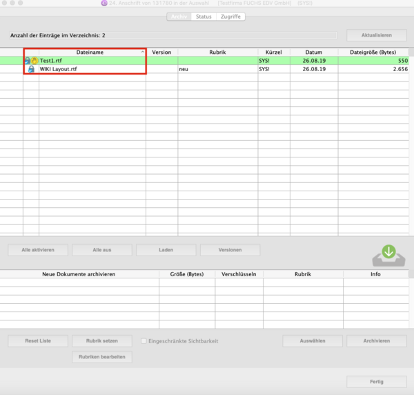Mit der Schaltfläche "Archivieren" werden die Dateien verschlüsselt und Übertragen. Die neuen Dateien werden Grün hinterlegt.
