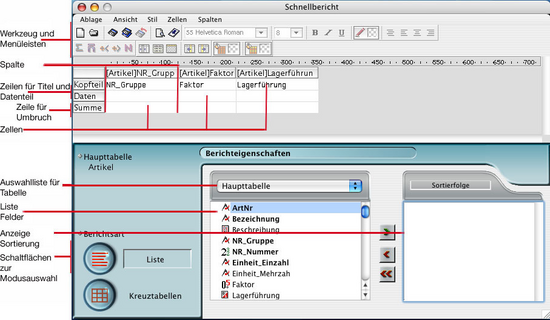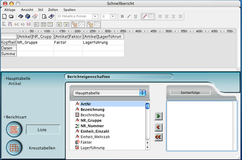 Hier legen Sie den Bericht an. Ziehen Sie hier Felder per Doppelklick, Drag&Drop oder über das Kontextmenü in den Bereich. Sie können auch Formeln hinzufügen, die Spaltenbreite anpassen, Umbrüche oder Formeln löschen, Farben und Ränder für die Zellen definieren, etc.