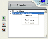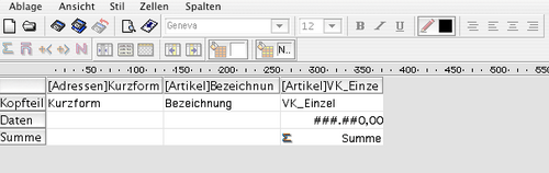 Die Zeile „Daten” wird immer durch den Inhalt des gewählten Feldes gefüllt. Die Zeile „Summe” lässt Berechnungen am Ende der Auflistung zu. Wird z.B. am Ende einer Spalte eine Berechnung gewünscht, so kann Sie durch einen Doppelklick hinzugefügt werden. Verwenden Sie dabei die Berechnungssymbole in der Werkzeugleiste.