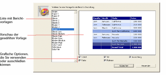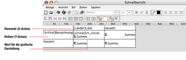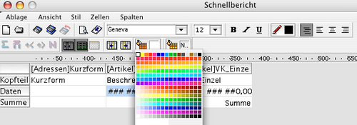 Sie können beim Anlegen des Schnellberichts verschiedene Schriftarten, -grössen, -stile sowie die Ausrichtung und Farben festlegen. Das ist möglich für Text, Daten und Summenberechnungen in Zeilen, Spalten oder Zellen. Weisen Sie dem Datenteil des Berichts eine Eigenschaft zu, sehen Sie das Ergebnis erst in der Vorschau oder beim Drucken.