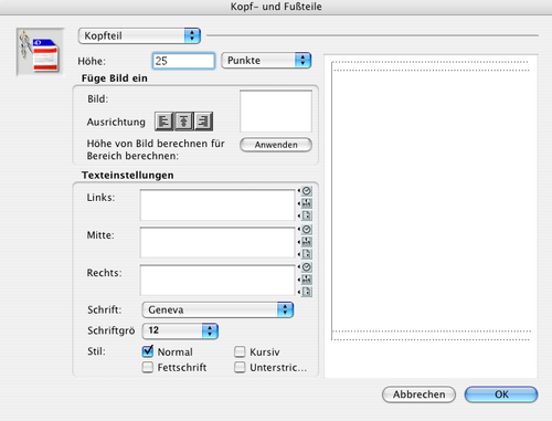 Standardmäßig sind für Kopf- und Fußteil jeweils 25 Punkte angegeben. Sie können sowohl den Wert als auch die Einheit ändern. Die eingegebene Höhe für Kopf- und Fußteil wird in der Seitenvorschau mit gestrichelten Linien angezeigt. So können Sie vorab sehen, wie Kopf- und Fußteil im gedruckten Bericht erscheinen.