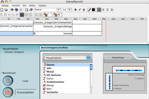 - Im Modus Liste erscheint die dem Bericht zugewiesene Sortierreihenfolge sowie die Richtung aufsteigend oder absteigend. Jedes eingefügte Feld erzeugt im Bereich des Schnellberichts eine Zeile für Zwischensumme. Im Modus Kreuztabelle erscheint die Sortierrichtung für jede der Datenquellen.