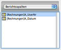 - Hier wählen Sie durch Doppelklick oder per Drag&Drop die Felder für den Bericht aus. Sie zeigt entweder die Felder der Haupttabelle, die Hierarchie Liste von allen verknüpften Tabellen oder die Liste aller Tabellen und Felder der Datenbank. Die Art der Anzeige wählen Sie in der darüber liegenden DropDown Liste aus. Indizierte Felder erscheinen in Fettschrift. Sie können auch die Felder von verknüpften Tabellen anzeigen und auswählen.