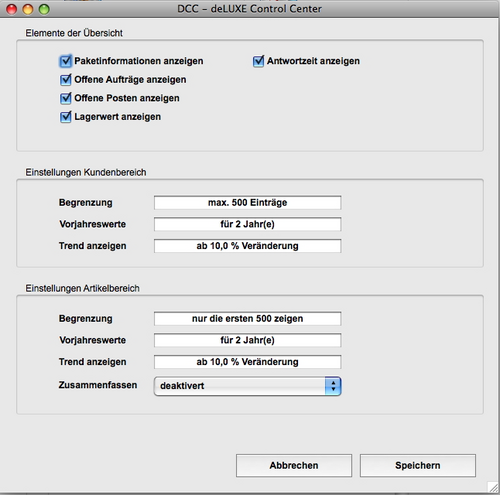 Das DCC hat eigene Einstellungen im Menü Ablage. Hier können Sie festlegen welche Informationen in den einzelnen Bereichen angezeigt werden sollen.