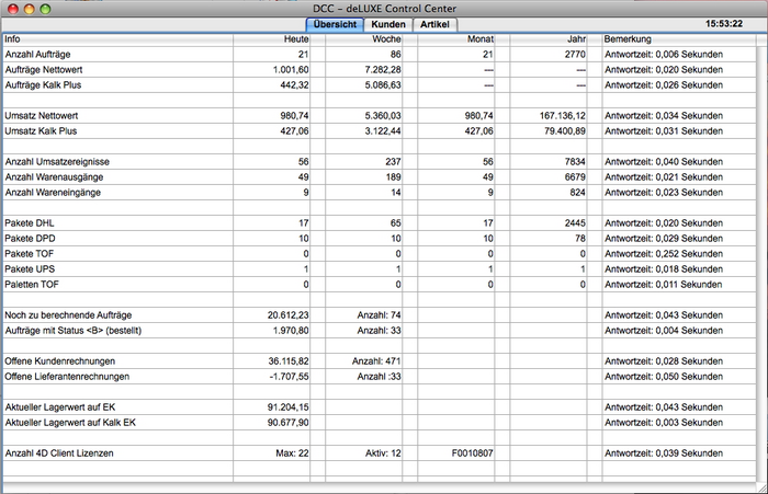 Das DCC arbeitet in einem eigenen Prozessfenster und kann somit parallel zum Hauptfenster benutzt werden. Der Dialog besteht aus 3 Bereichen (Übersicht / Kunden / Artike). Die Berechnungen der Umsätze wurde so optimiert, dass möglichst wenig Serverlast erzeugt wird. Die Berechnungen erfolgen alle lokal auf dem Arbeitsplatz. Die Übersichtseite wird automatisch alle 5 Minuten neu berechnet.