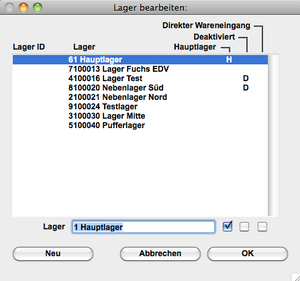 Hinweis: In diesem Fenster haben Sie auch die Möglichkeit, über die Schaltfläche „Lager bearbeiten“, ein Lager neu anzulegen oder auch zu deaktivieren.