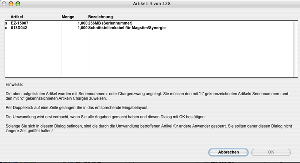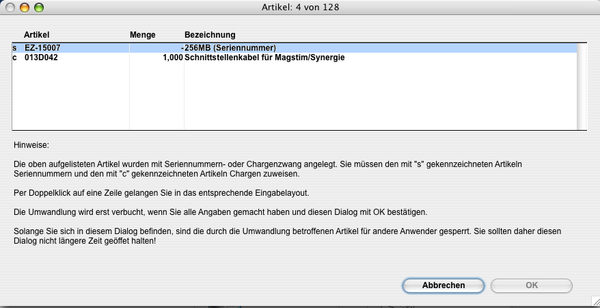Handelt es sich bei der Ware um einen Artikel mit Seriennummer, wählen Sie unten rechts über die Schaltfläche „Seriennummern...“ die entsprechenden Artikel aus.