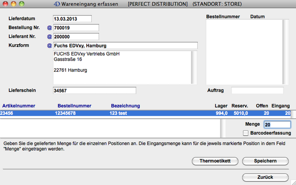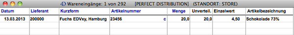 In unserem Beispiel ist nur die gelieferte Menge, Lieferantennummer und Artikelbezeichnung zu ersehen.