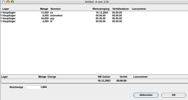 Jetzt wechseln Sie wieder zum PopUp-Menü mit der Lagerauswahl, tragen die Restmenge und die Lagerplatz/Chargennr. ein. Danach speichern Sie die Zuweisung der Lagerplätze über die Schaltfläche „Buchen“.