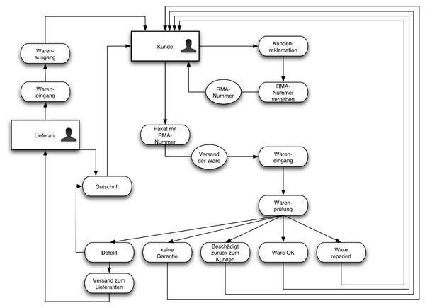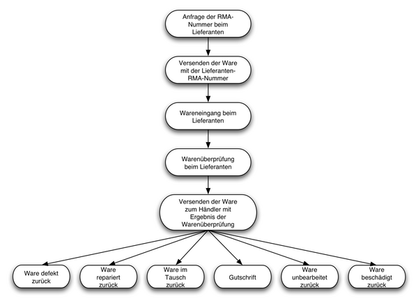 RMA steht für Return Merchandise Authorization oder auch Return Material Authorization und bezeichnet die Abwicklung von Reklamationssendungen. Der Ablauf einer solchen Abwicklung gestaltet sich immer, wie in der folgenden Abbildung gezeigt: