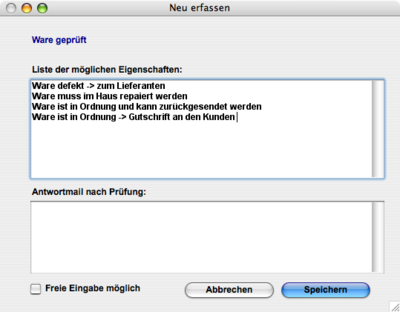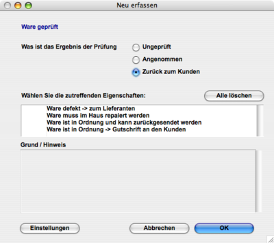Hier können Sie nun festlegen was die Prüfung ergeben hat. Nehmen Sie die Reklamation an oder senden Sie sie zurück zum Kunden? Die darunter gelisteten Eigenschaften können dazu ausgewählt werden. Ist Ihr Fall dort nicht vorhanden, so können Sie eine weitere Eigenschaft über die Schaltfläche „Einstellungen“ anlegen: