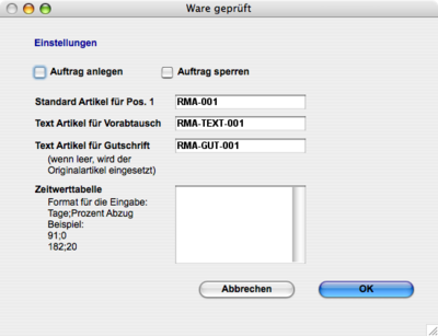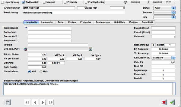 Mehr Information muss in dem Artikel nicht angelegt werden. Wünschen Sie jedoch eine Abrechnungsmöglichkeit über diesen Artikel, weil Sie zum Beispiel die Bearbeitung des RMA-Auftrages berechnen, so können Sie auch einen VK und eine Mengenberechnung (z.B. in Stunden) hinterlegen. Wenn Sie Textpositionen in Ihrem RMA-Auftrag wünschen, die den Reklamationsfall genauer beschreiben sollen, dann müssen Sie zusätzlich für jeden Fall (Gutschrift, Vorabtausch) einen Textartikel anlegen: