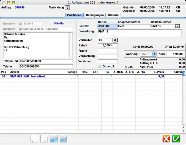 Wird aus der RMA Liste ein Lieferantenauftrag erstellt, wird nun nicht mehr der Kundenansprechpartner eingesetzt. Stattdessen wird der RMA Ansprechpartner des Lieferanten im Auftrag benutzt. Der RMA Ansprechpartner wird durch eine Funktion die mit "RMA" beginnt gekennzeichnet. Ist kein Ansprechpartner beim Lieferanten gekennzeichnet, bleibt das Auftragsfeld leer.