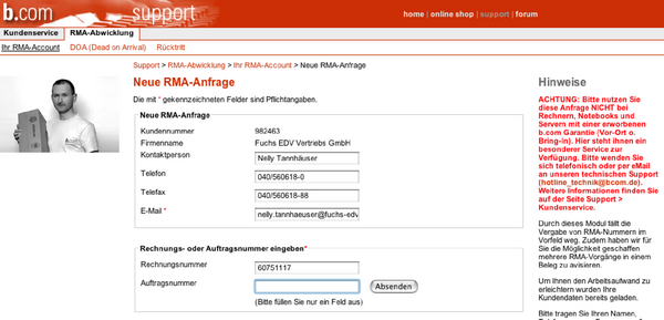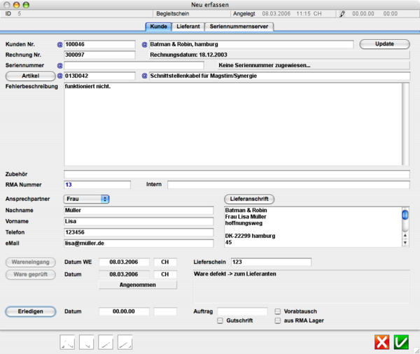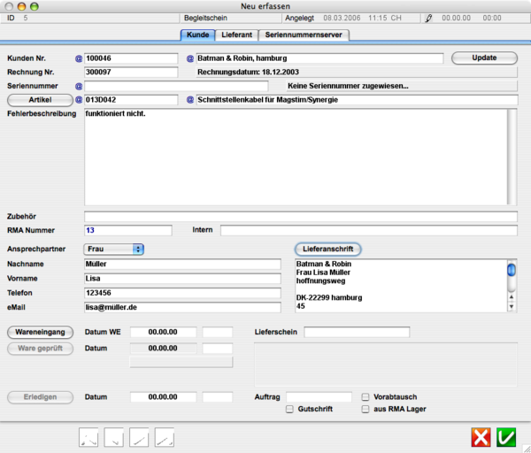 Fragen Sie jetzt den Kunden nach der Fehlerbeschreibung, seinen persönlichen Daten und ggf. nach der Seriennummer des reklamierten Artikels. Tragen Sie diese Daten in die vorgesehenen Felder ein.