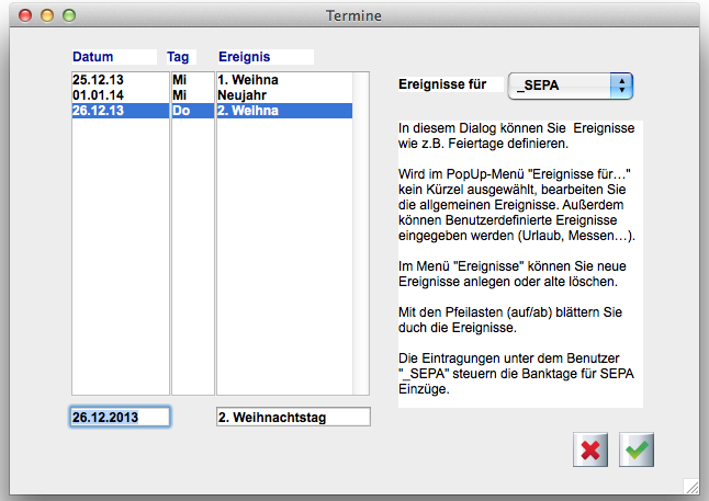 Zur Berechnung der Werktage können „Ereignis“ für den User „_SEPA“ angelegt werden. Das Modul überspringt dann die hier angegebenen Tage bei der Berechnung der Werktage.