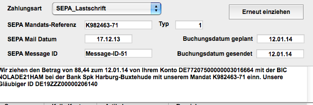 Im PopUp Menü mit den Zahlungsarten steht nun auch „SEPA Lastschrift“ zur Verfügung. Intern hat diese Zahlungsart den Wert „12“.