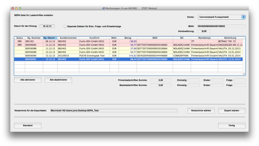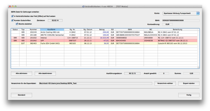 Die markierten Verbindlichkeiten werden beim Aufruf der Funktion geprüft. Dabei erfolgt eine Prüfung der IBAN Prüfziffer. Ist eine IBAN Nummer ungültig oder der Betrag der Verbindlichkeit Null oder negativ, wird die Zeile rot markiert.
