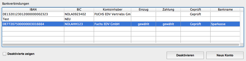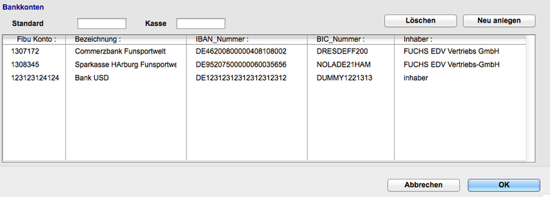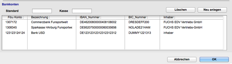 In den Konten Einstellungen müssen die IBAN und BIC Daten der für die Zahlung verwendeten Konten angegeben werden.