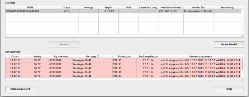 Zum Mandat wird die Benutzung gespeichert. Eine Benutzung kann in den Konto Einstellungen des Kunden als <nicht eingereicht> gekennzeichnet werden. Dies kann bei Einzelmandaten notwendig sein, wenn eine Datei nicht eingereicht wurde und erneut erstellt werden soll.