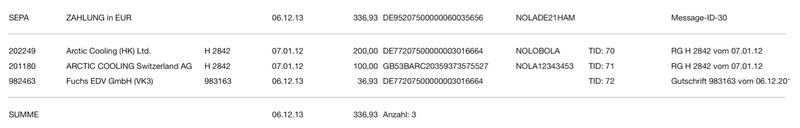 Pro Payment Block gibt es am Anfang eine grau hinterlegte Zeile mit Anzahl und Summe der Einzüge.