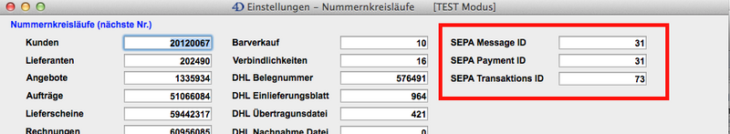 Jede SEPA Zahlung muss eine eindeutige ID erhalten. Für die drei Ebenen Message, Payment und Transaktion gibt es neue Counter in den Nummernkreisläufen. Stellen Sie alle drei Werte zum Beginn auf 1.