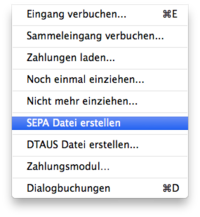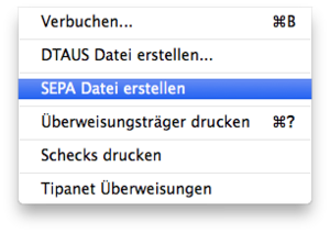 Der Menüpunkt „SEPA Datei erstellen“ zur Erstellung der Zahlungsdatei befindet sich im Menü Zahlungen in der Liste der Verbindlichkeiten.