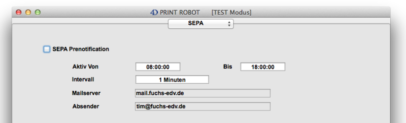 Das Versenden der Mails übernimmt dann ein PrintRobot Client. Hier kann in den Einstellungen das Zeitintervall, Mailserver und Mailabsender eingetragen werden.