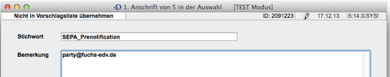 In den Anschriften wird ein Stichwort „SEPA_Prenotification“ angelegt. In die Bemerkung tragen Sie die Mailadresse für die Benachrichtigungen ein.