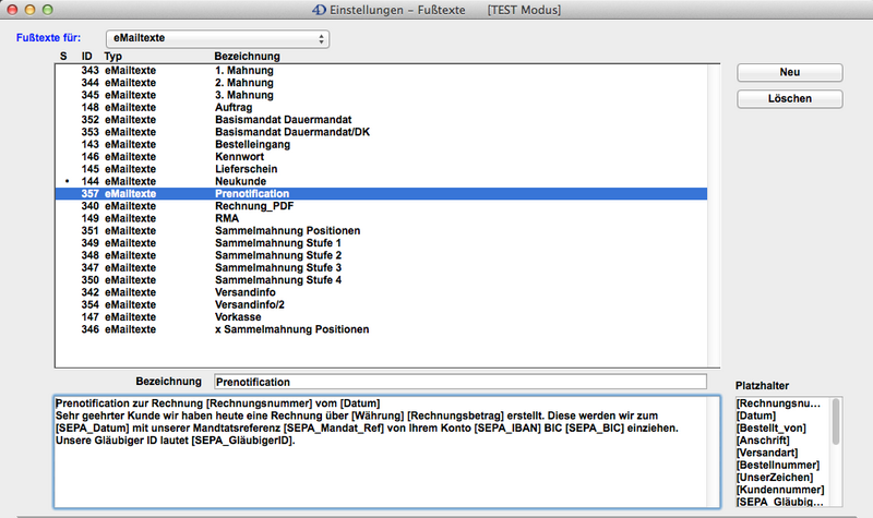 Damit in den Fußtexten der Rechnungen eine entsprechende Vorankündigung (Prenotification) der Lastschrift erfolgen kann, stehen entsprechende Platzhalter für Mandat, Gläubiger ID, IBAN, BIC und Fälligkeitsdatum zur Verfügung.
